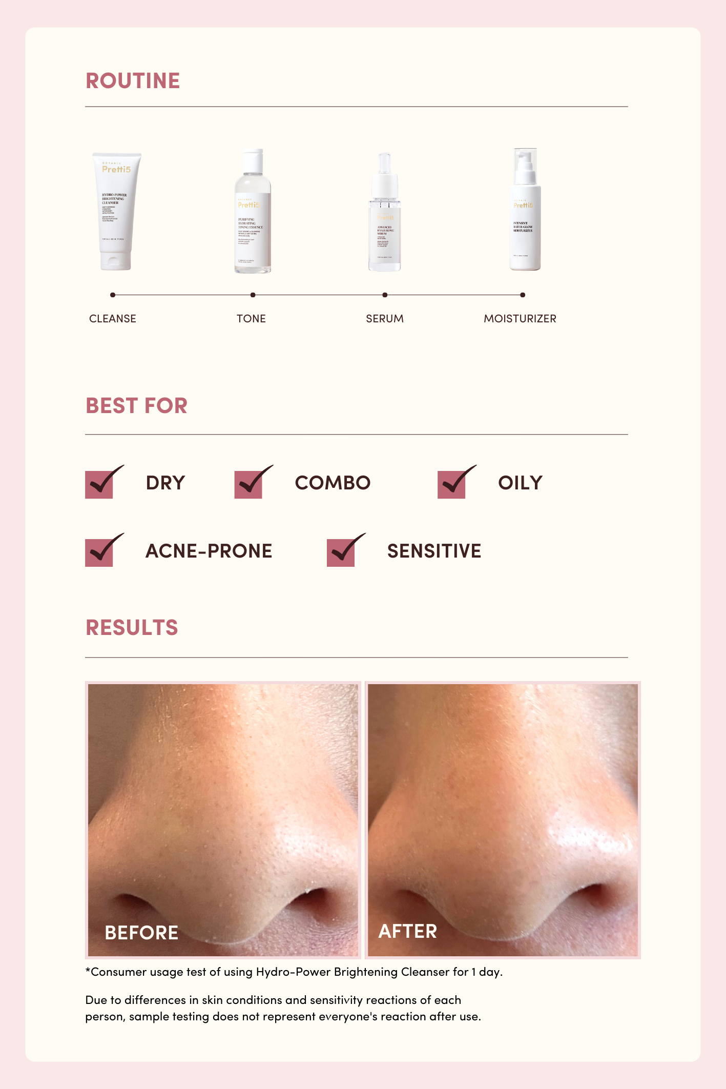 *Data is taken from a questionnaire survey of 30 real users of Pretti5 who continuously used the HYDRO-POWER BRIGHTENING CLEANSER for 3 months. Actual results may vary from person to person.